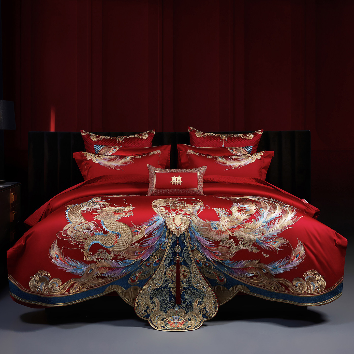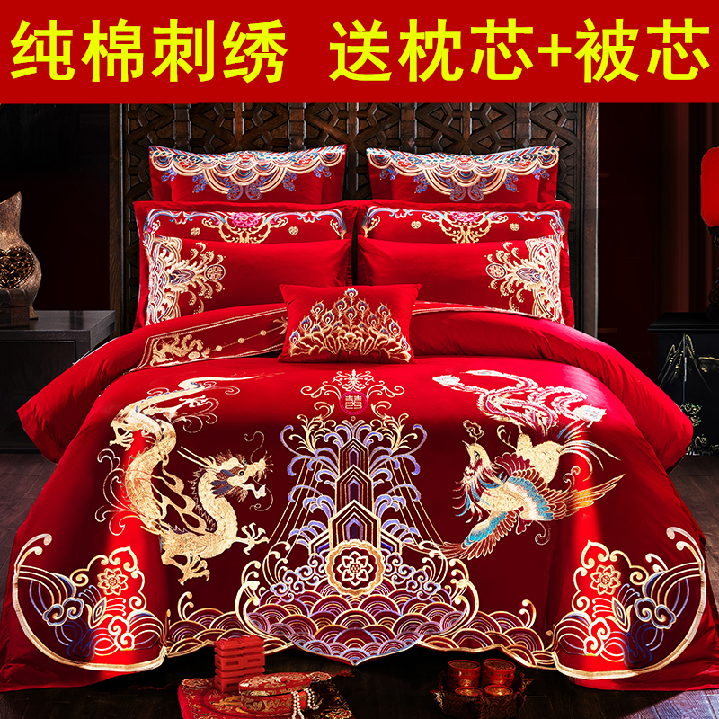 140支全棉结婚四件套床上用品大红色龙凤刺绣高档婚庆十件套喜被