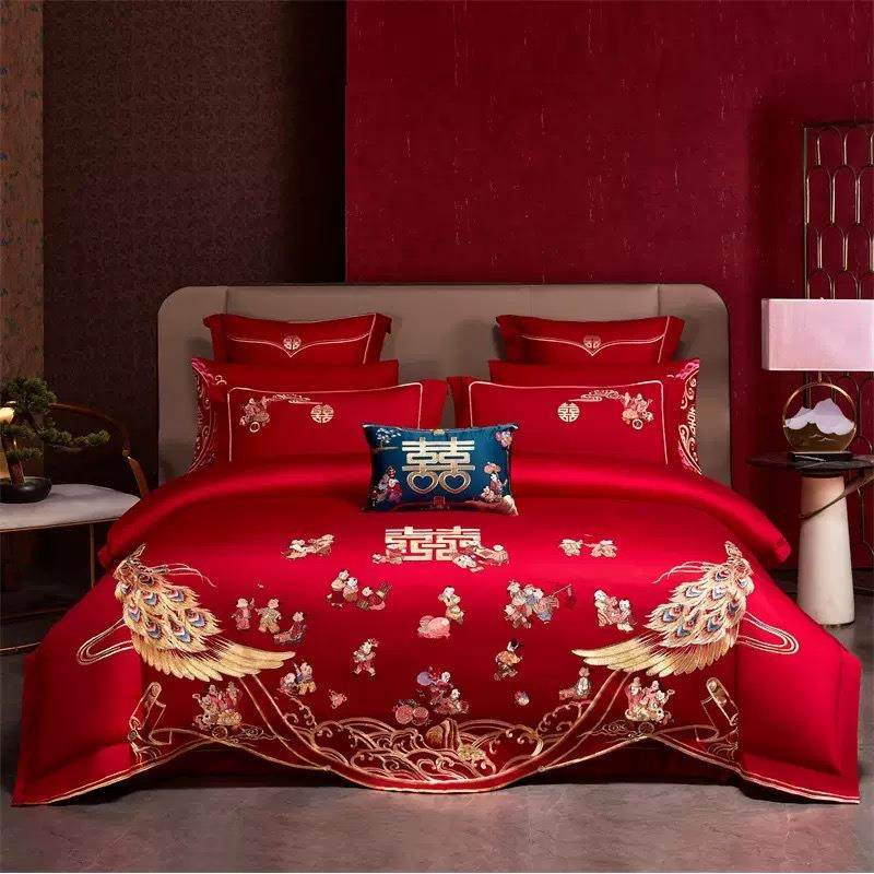 140s支全棉婚庆四件套大红色喜被子结婚六十件套刺绣婚房床上用品