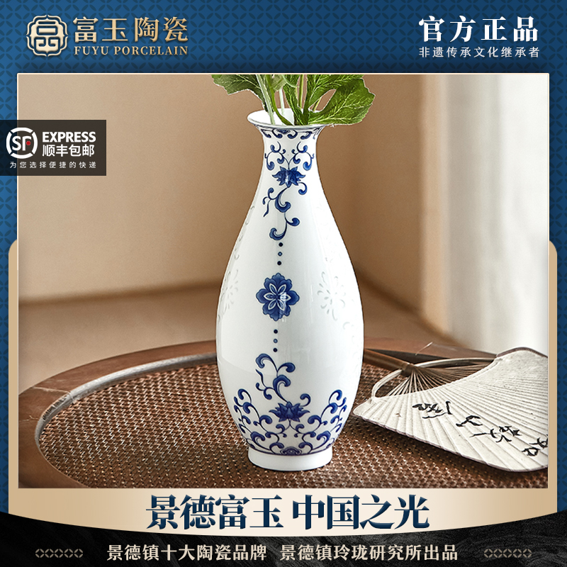 富玉 透光玲珑瓷观音瓶景德镇卧室创意桌面装饰品中式玄关花瓶子