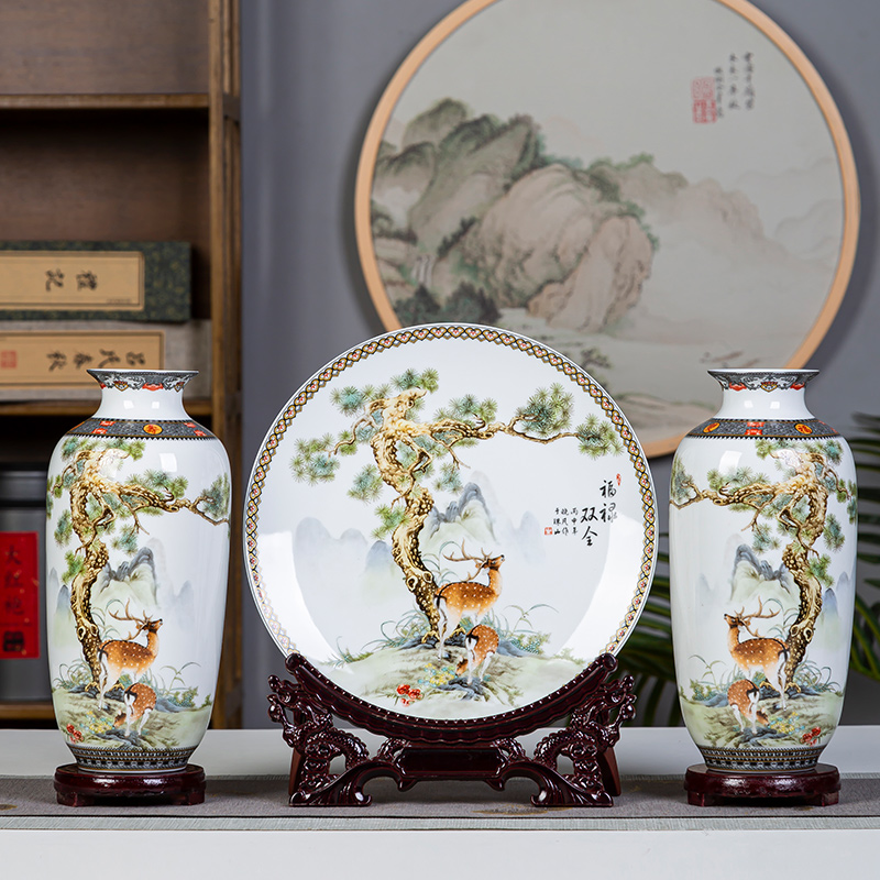 景德镇陶瓷器福禄双全三件套花瓶子新中式家居客厅插花装饰品摆件