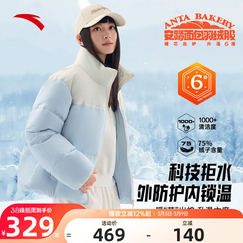 安踏面包羽绒速暖羽绒服女2025冬季高蓬鸭绒加厚保暖四防棉服外套