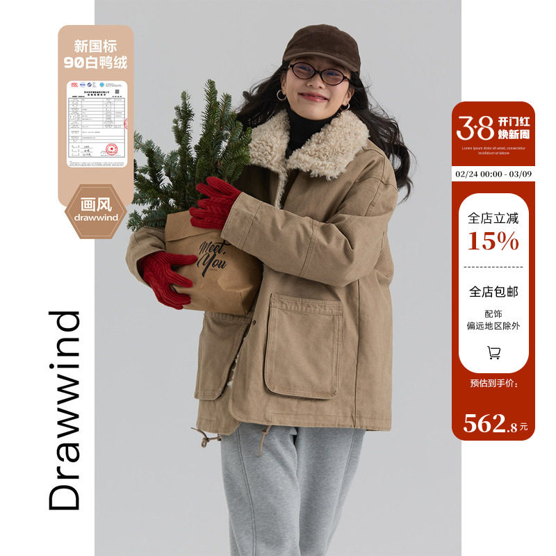 画风drawwind冬季砂洗派克羽绒服女加厚保暖工装拼接毛毛翻领外套