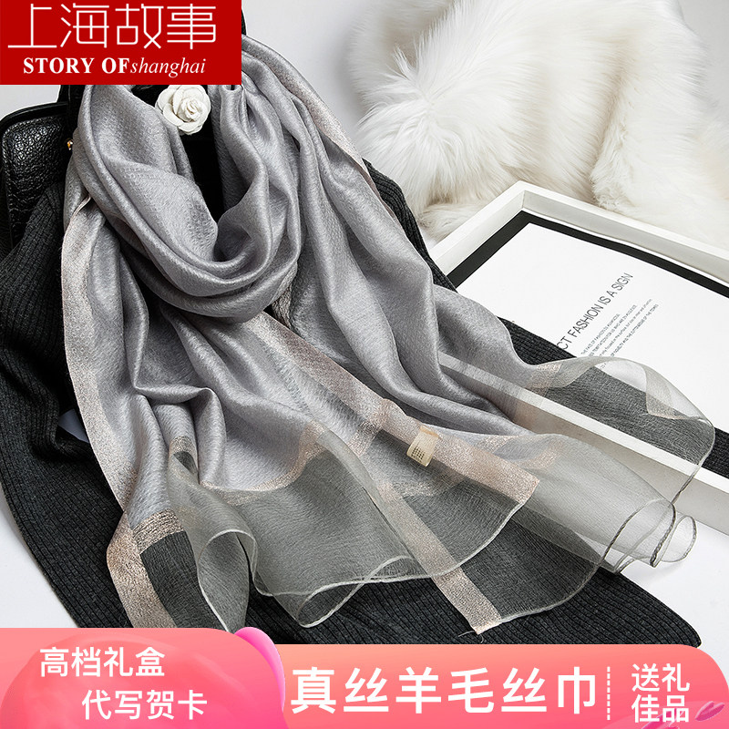 上海故事桑蚕丝羊毛提花丝巾双面印花秋冬保暖御寒大方巾披肩礼盒
