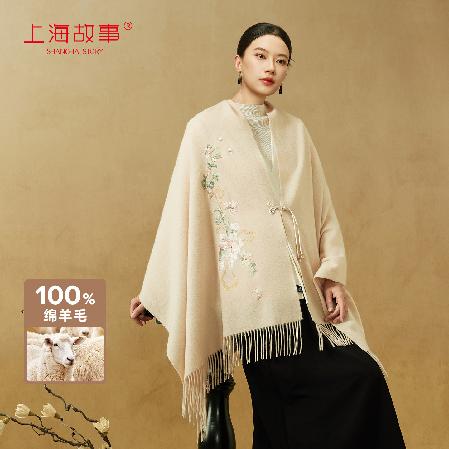 上海故事秋冬绵羊毛刺绣围巾加厚保暖新中式国风披肩送长辈礼盒装