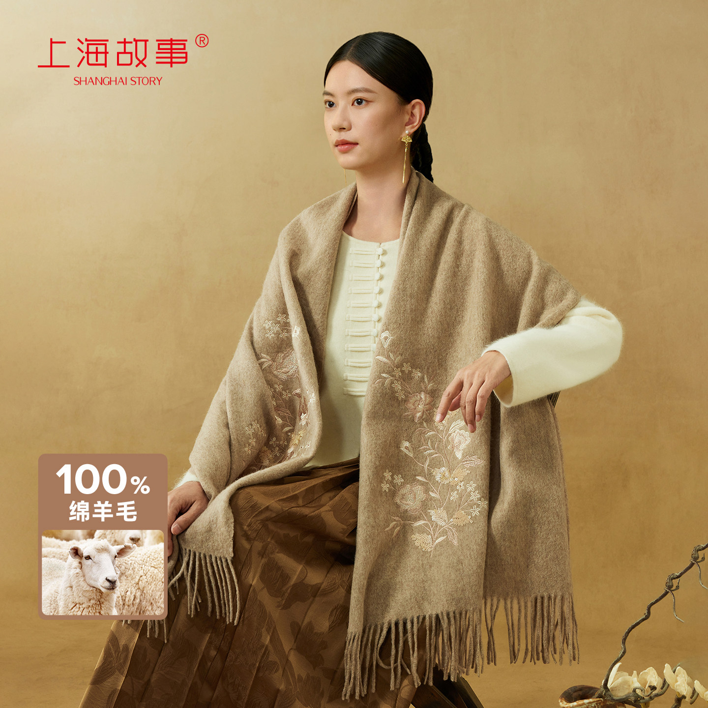 上海故事秋冬绵羊毛刺绣围巾加厚保暖柔软不扎送长辈妈妈款礼盒装