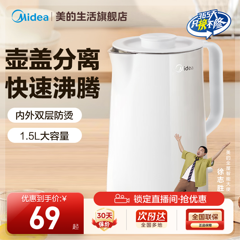 美的电热水壶家用大容量烧水壶双层防烫电水壶保温自动断电分离式