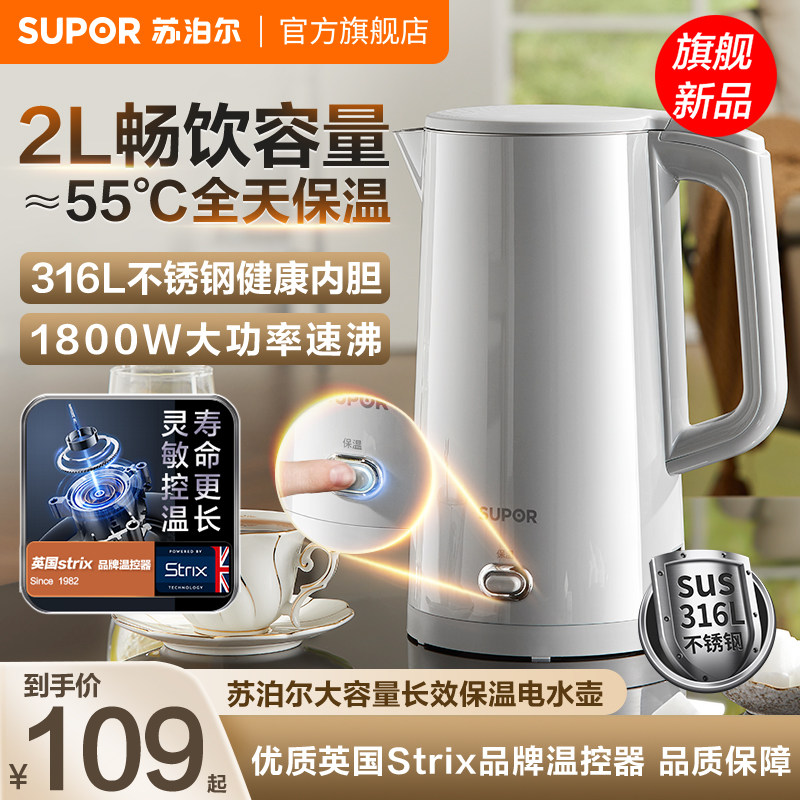 苏泊尔电热水壶2L快速家用烧水保温电水壶316L不锈钢双层开水壶