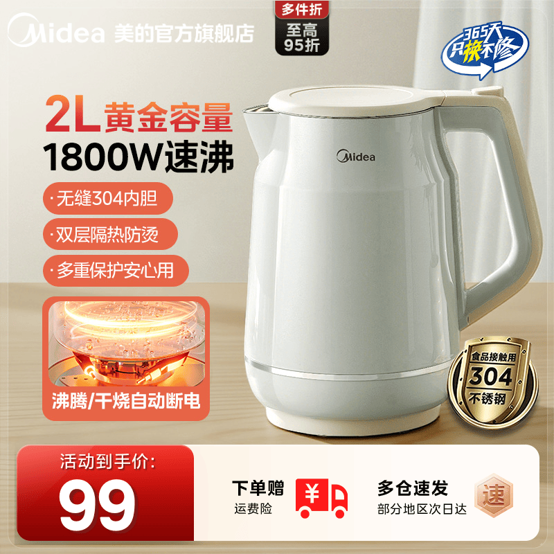 美的电热水壶家用2L大容量保温双层自动断电不锈钢烧水壶官方正品