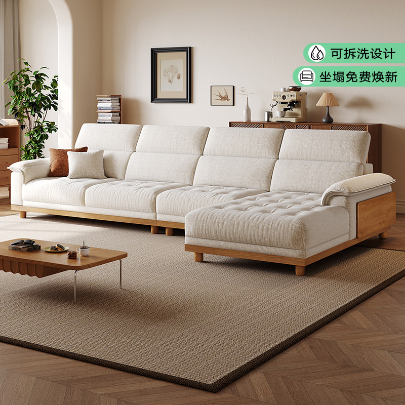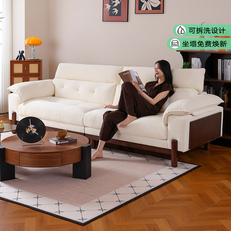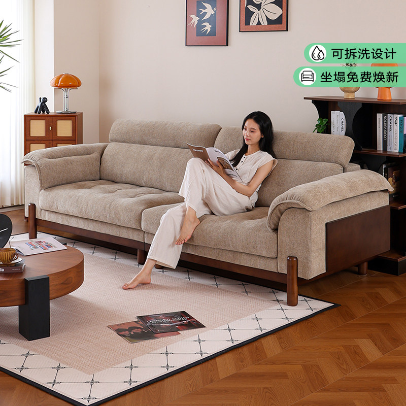 拉芙菲原木风可拆洗雪尼尔布艺沙发奶油实木小户型中古风客厅沙发