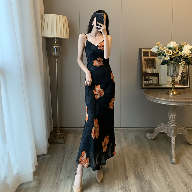 法式复古碎花裙吊带连衣裙雪纺裙修身收腰显瘦气质长款长裙女夏季