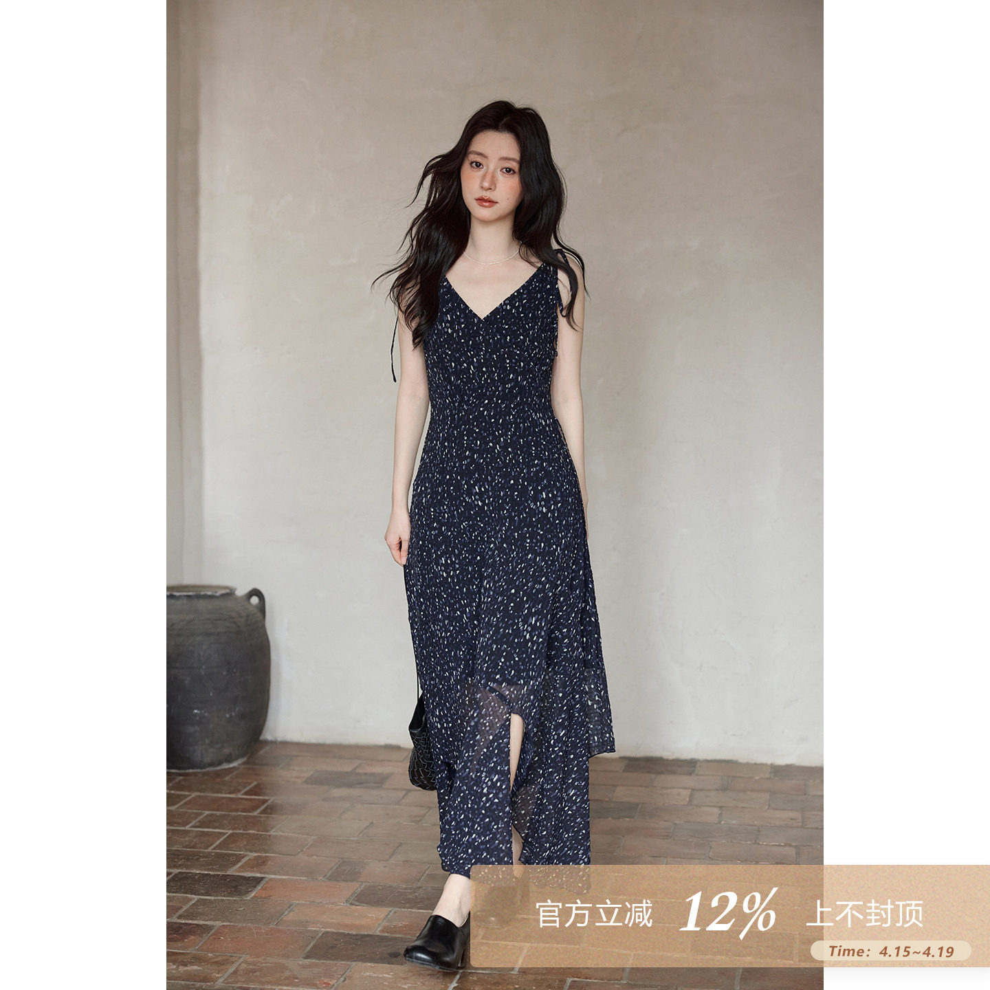 酒午春季复古蓝色星星印花100人丝V领吊带修身长款雪纺连衣裙女