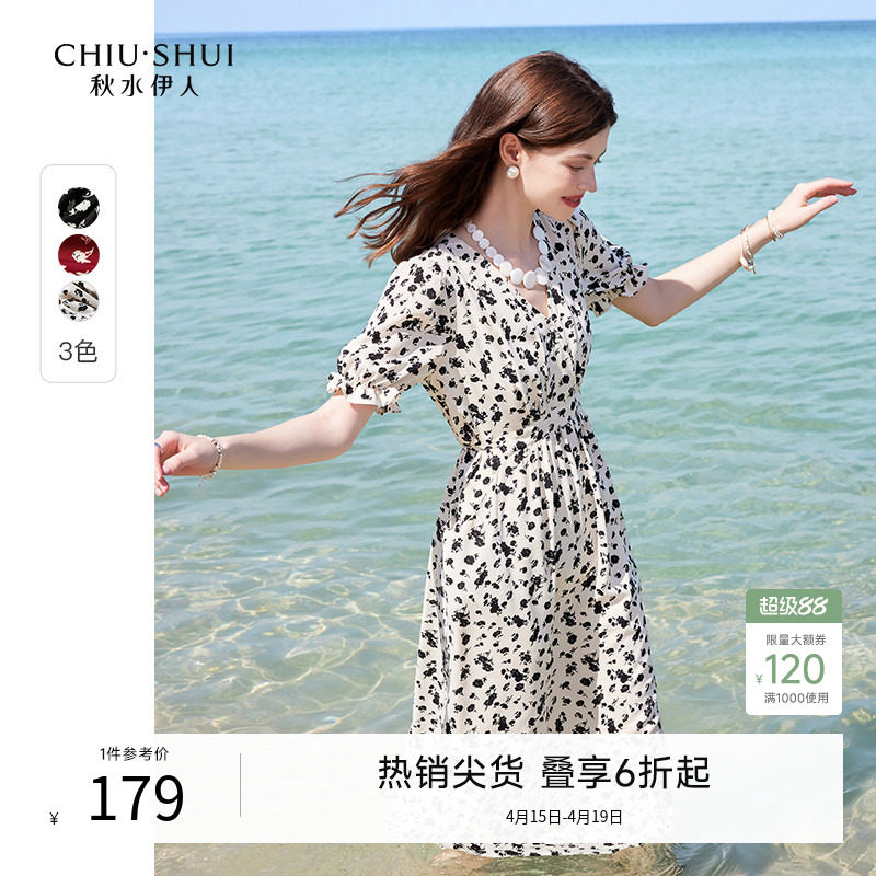 秋水伊人优雅方领度假连衣裙女2026年夏季新款碎花雪纺百搭中长裙