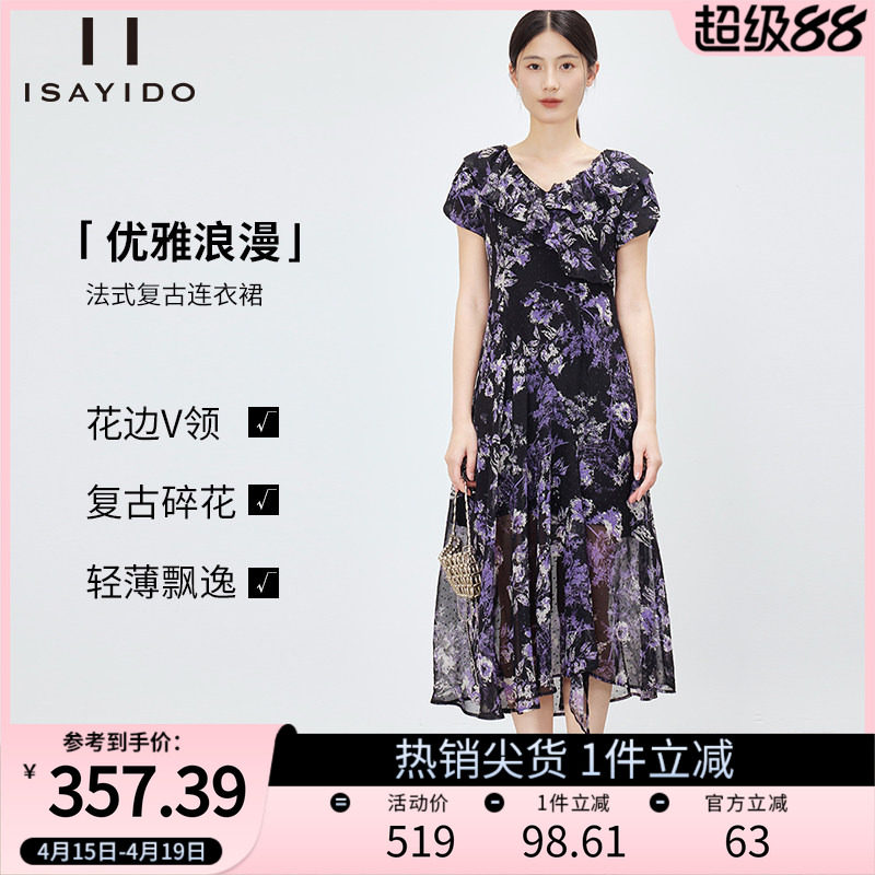 傲丝度浪漫度假风雪纺裙女夏季V领短袖碎花裙小个子中长款连衣裙