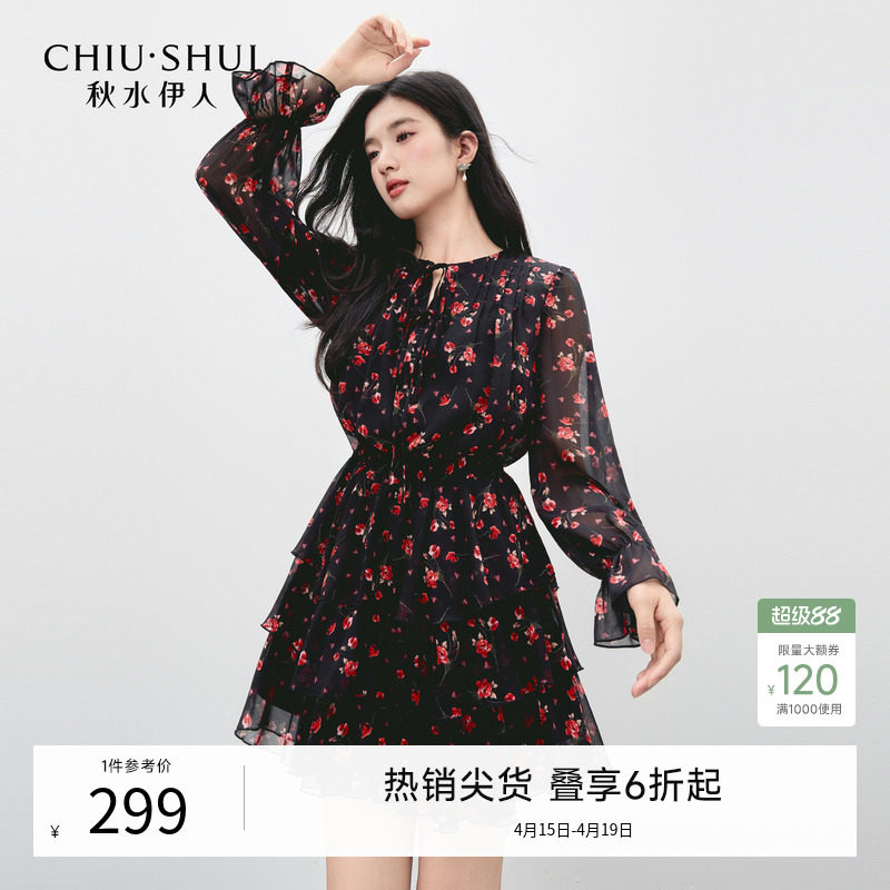 秋水伊人收腰碎花雪纺连衣裙2026年春季新款女V领蛋糕裙摆中长裙