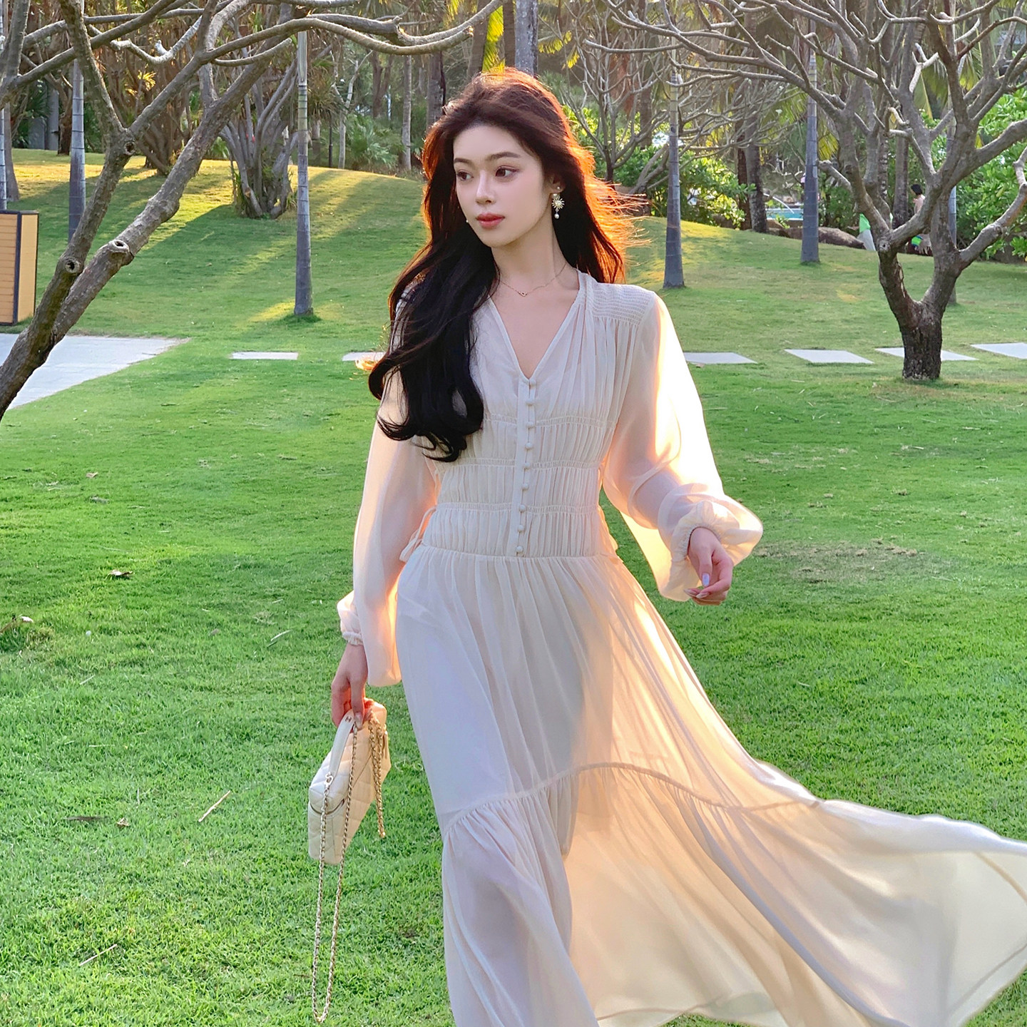 白色薄纱连衣裙女收腰长袖雪纺长裙长款沙滩裙海边度假裙子大摆裙