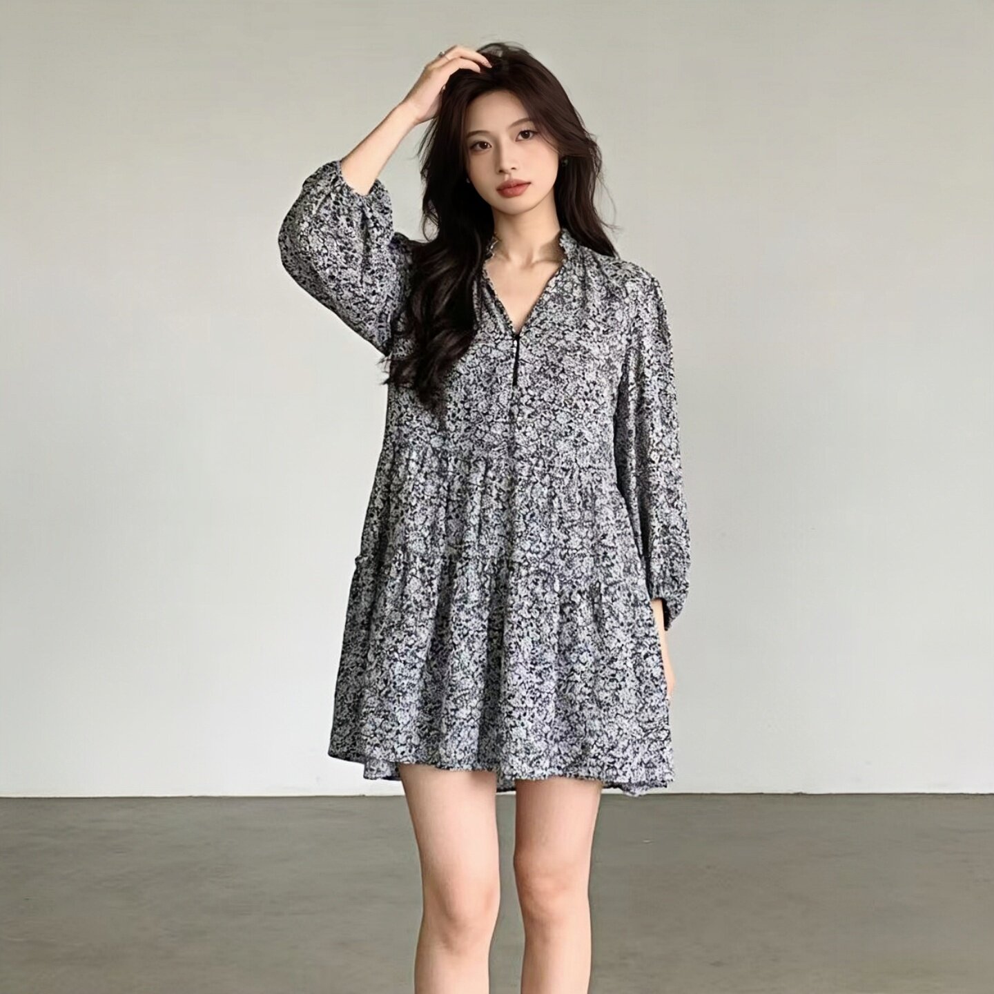 2026夏季法式复古风碎花连衣裙女 灯笼袖宽松显瘦中长款雪纺A字裙