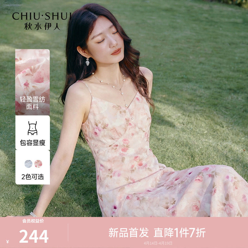 秋水伊人纯欲风碎花V领吊带连衣裙女夏2026新款雪纺收腰长款A字裙