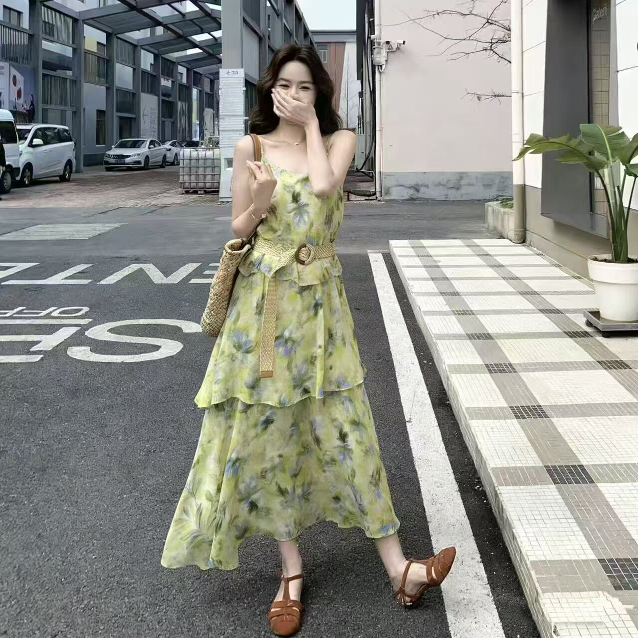 雪纺碎花吊带连衣裙2026春夏新款法式茶歇裙度假风中长款沙滩裙子