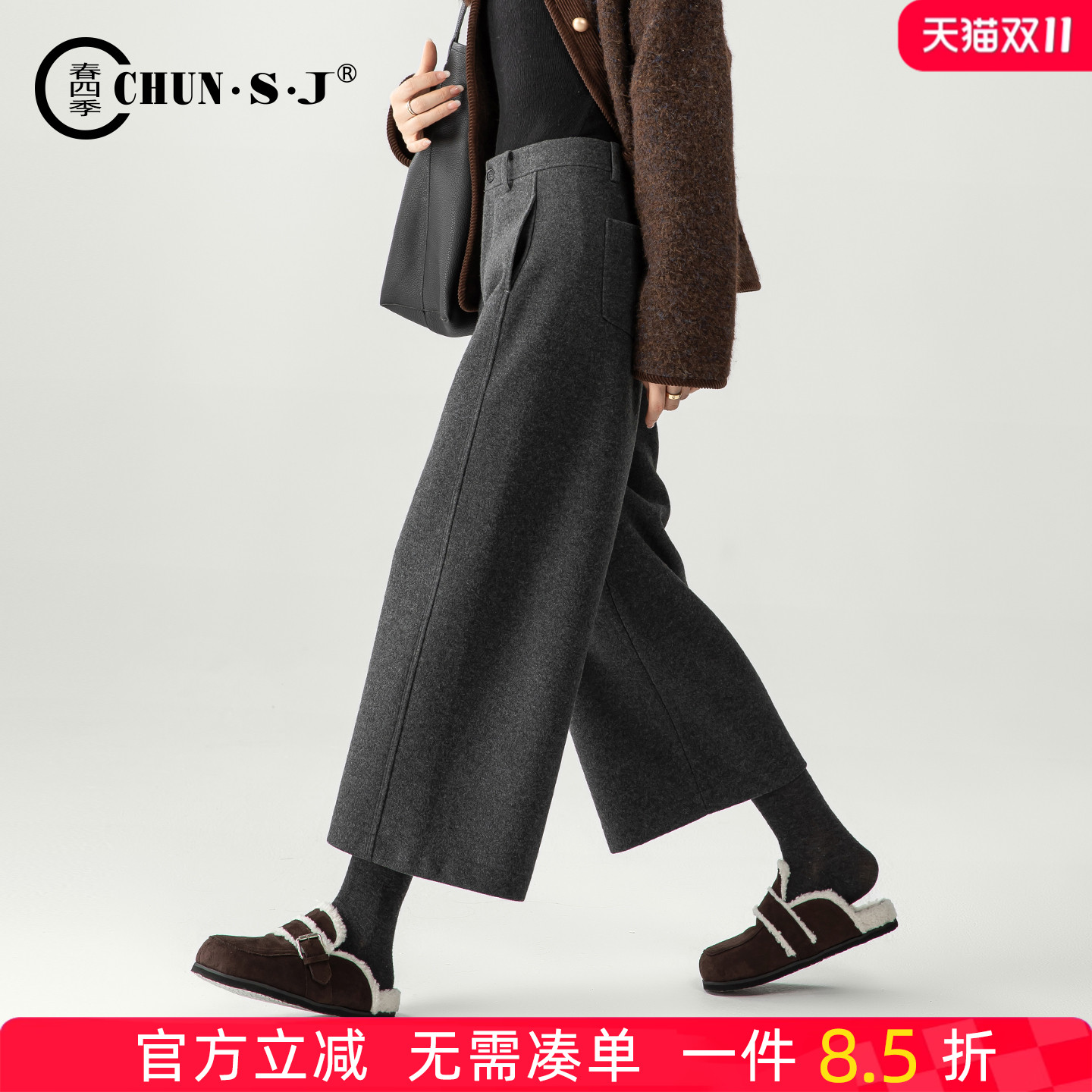 - 灰色毛呢阔腿裤