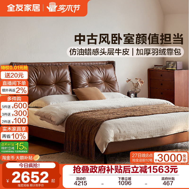 全友家居2025新款中古风头层牛皮软包双人床卧室小户型1.8m真皮床