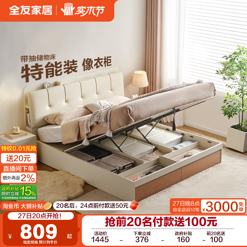 政府补贴全友家居简约落地高箱储物床主卧室收纳家具1米8双人皮床