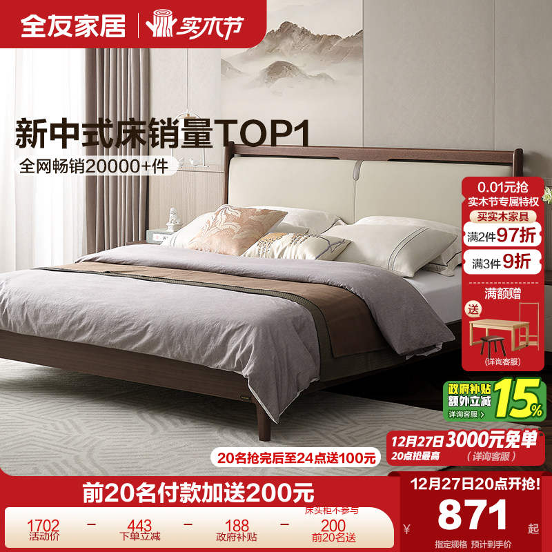 全友家居新中式软包床1米8主卧高端大气婚床实木床脚1米5双人皮床