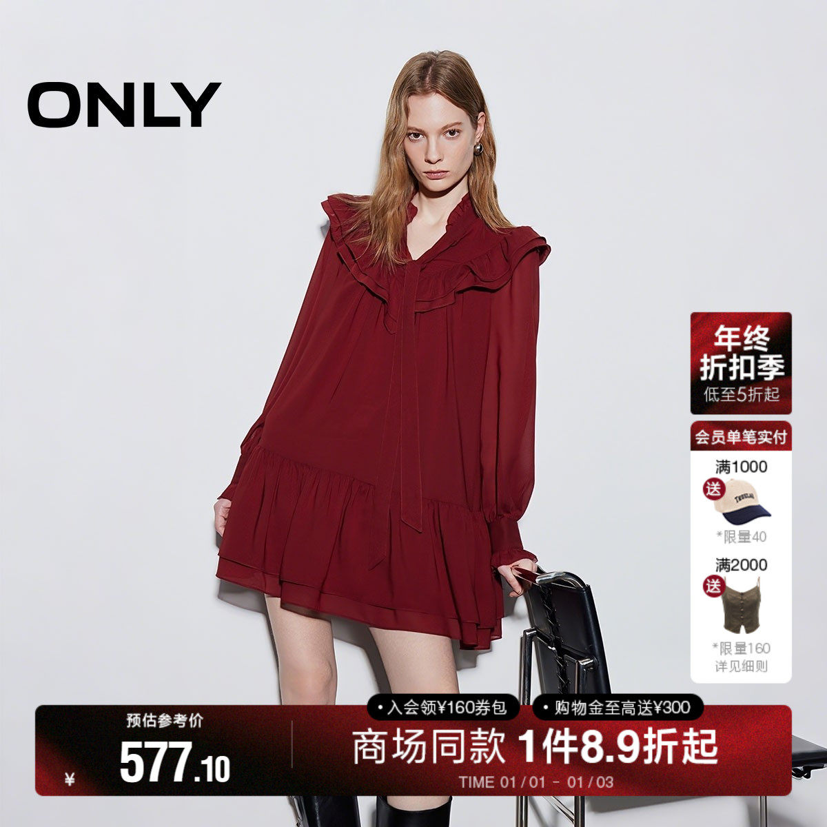 ONLY2026春季新款约会飘带层叠荷叶边垂顺A字红色短裙连衣裙女