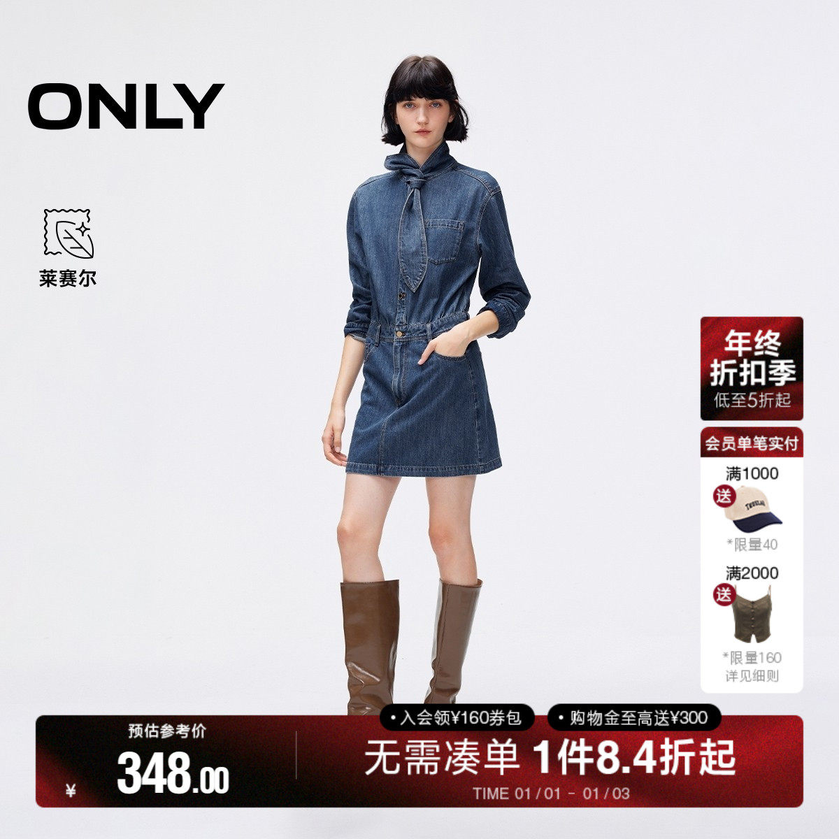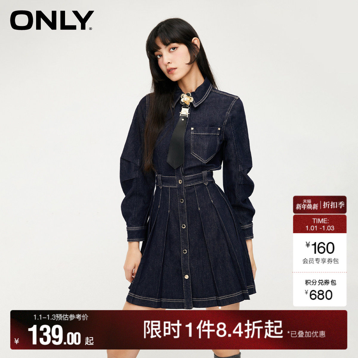 ONLY2025秋季新款法式优雅领结水洗正肩假两件短裙牛仔连衣裙女