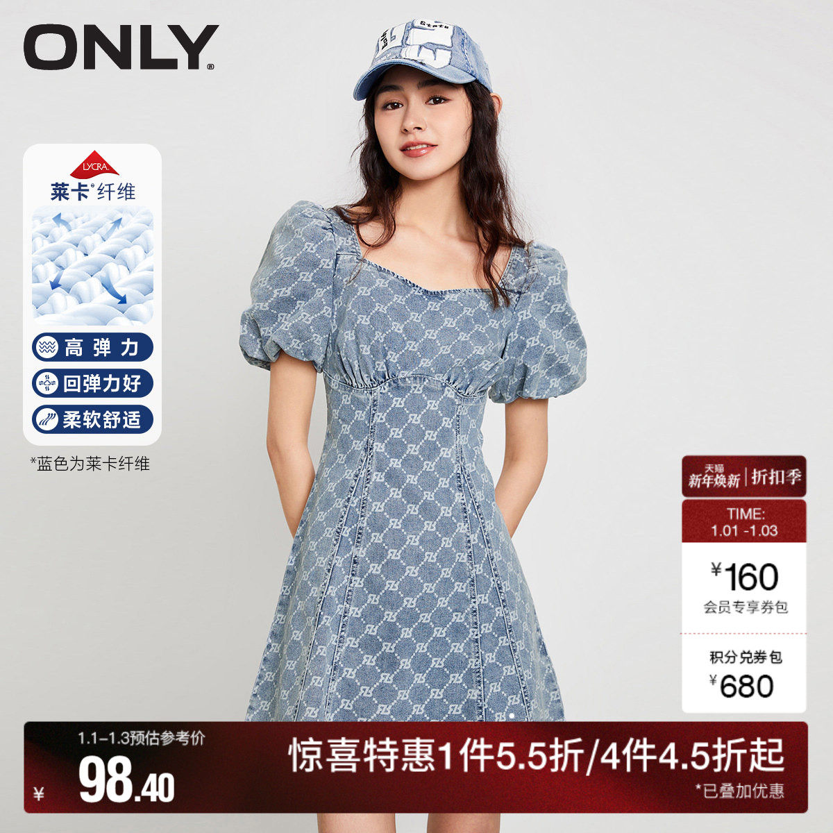 ONLY2026春季新款修身无袖圆领提花暗纹字母印花牛仔短裙连衣裙女