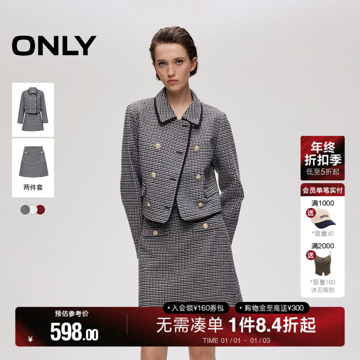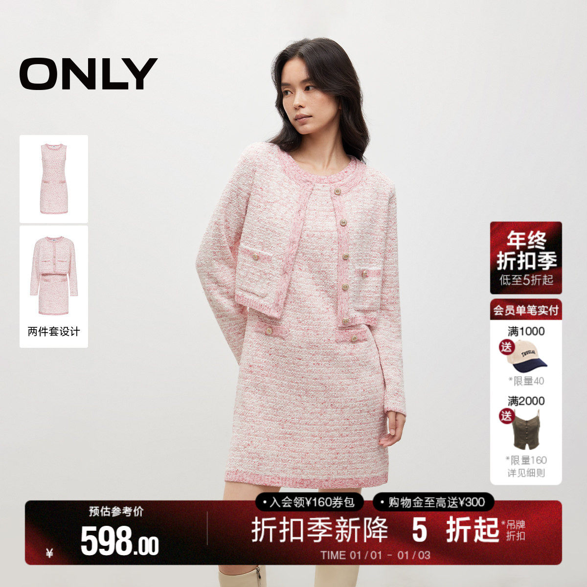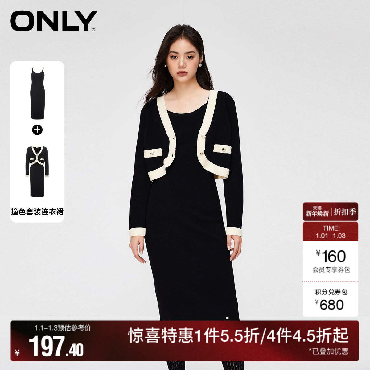 ONLY2025冬季新款重工优雅撞色精致纽扣小香风短裙套装连衣裙女