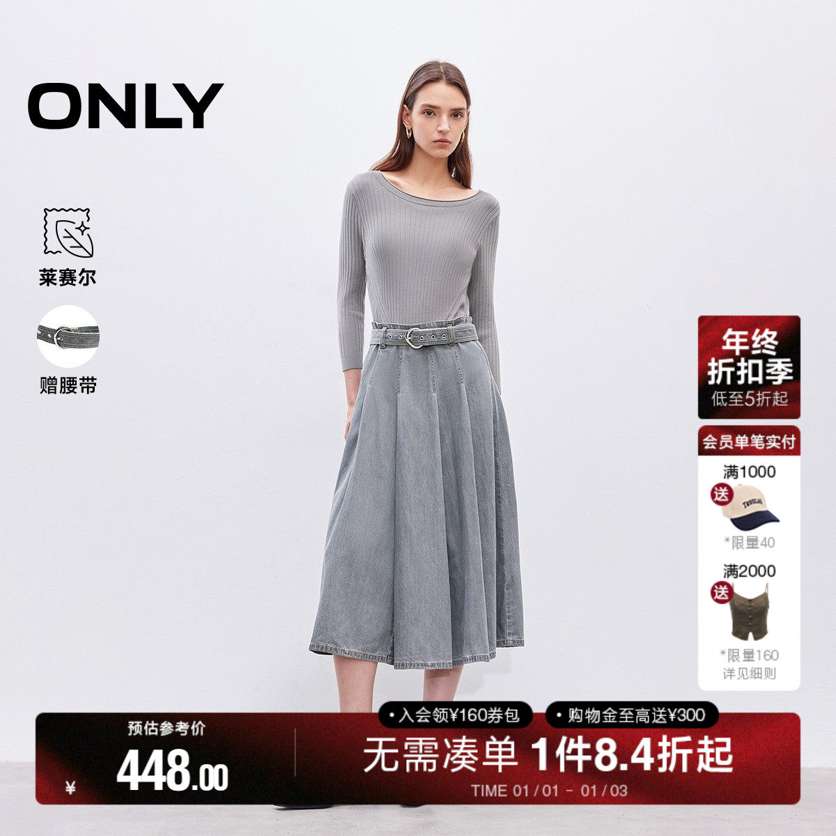 ONLY2025冬季新款异材针织拼接纵向螺纹收腰针织牛仔连衣裙女