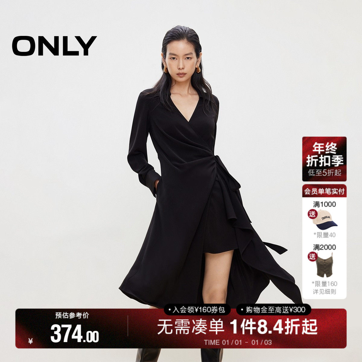 ONLY2026春季新款不规则下摆优雅交叉垂坠荡领中长款连衣裙女