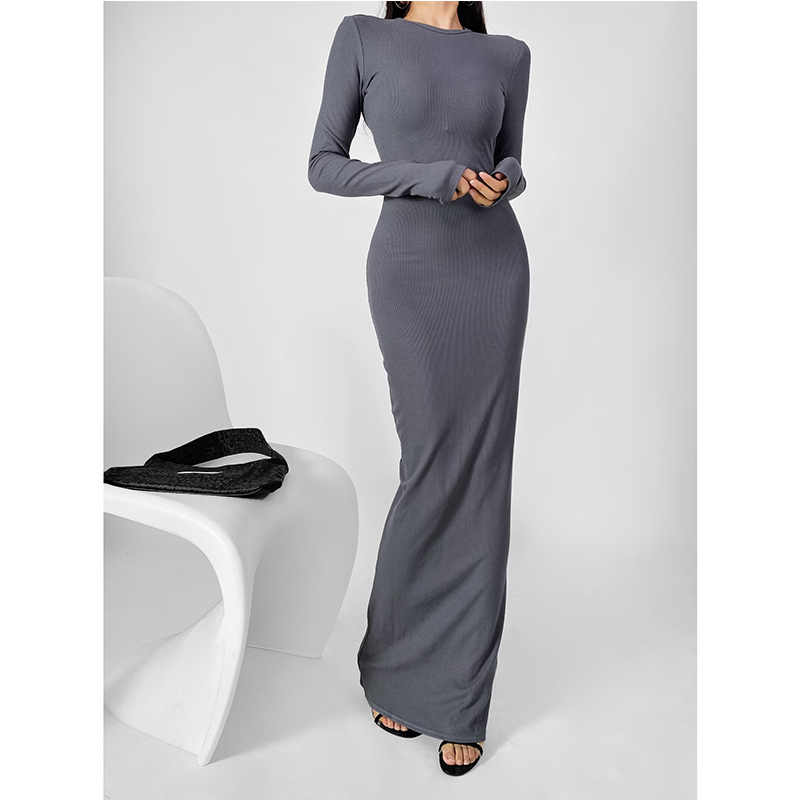 ZRSHOP欧美拖地收腰长袖显身材纯色圆领连衣裙加绒辣妹鱼尾裙子