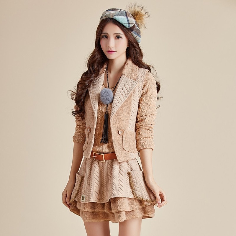 冬季连衣裙加绒加厚女两件套修身收腰拼接秋冬款显瘦蓬蓬裙套装裙