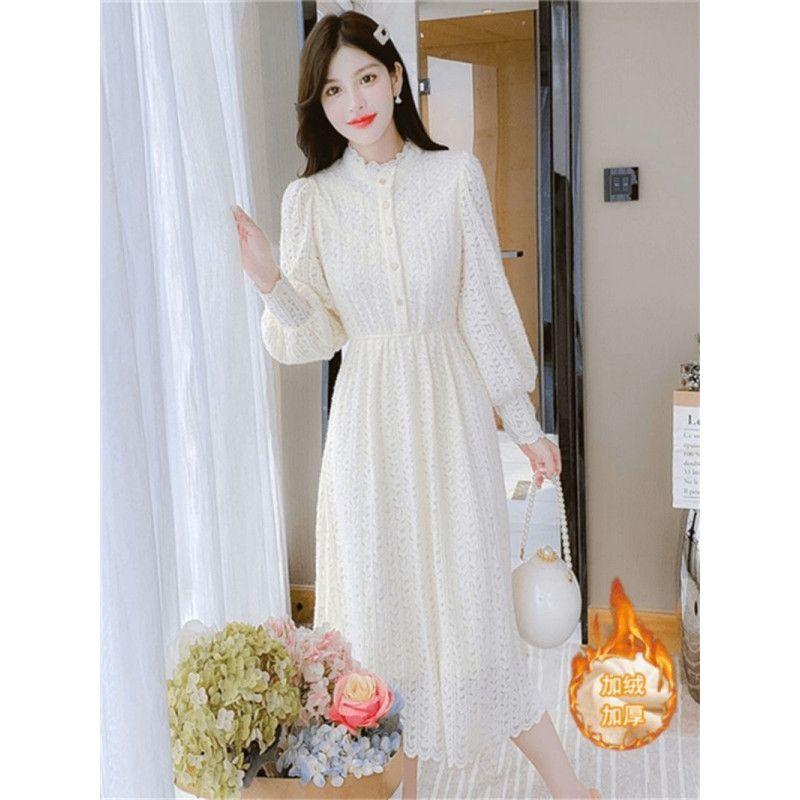高端精致蕾丝连衣裙加绒加厚女秋冬季新款小个子配大衣内搭打底裙
