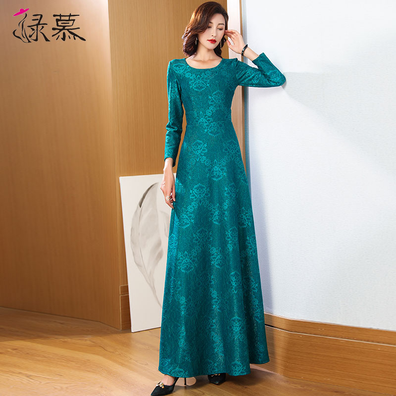 秋冬长袖连衣裙加绒复古气质加厚妈妈装中过膝长款显瘦打底连衣裙