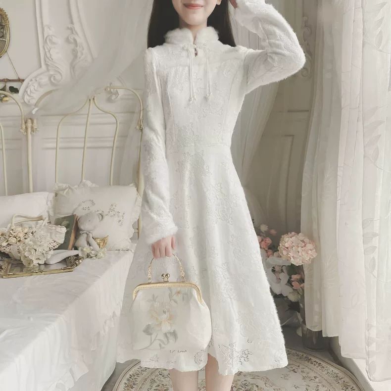 2024森系文艺花边立领精美刺绣长袖连衣裙加绒加厚宽松百搭长裙冬
