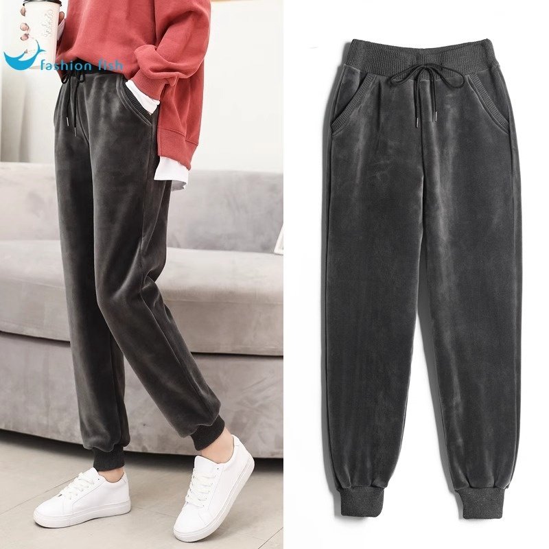 金丝绒运动裤女秋冬加绒加厚宽松束脚大码休闲卫裤灰色外穿裤子女
