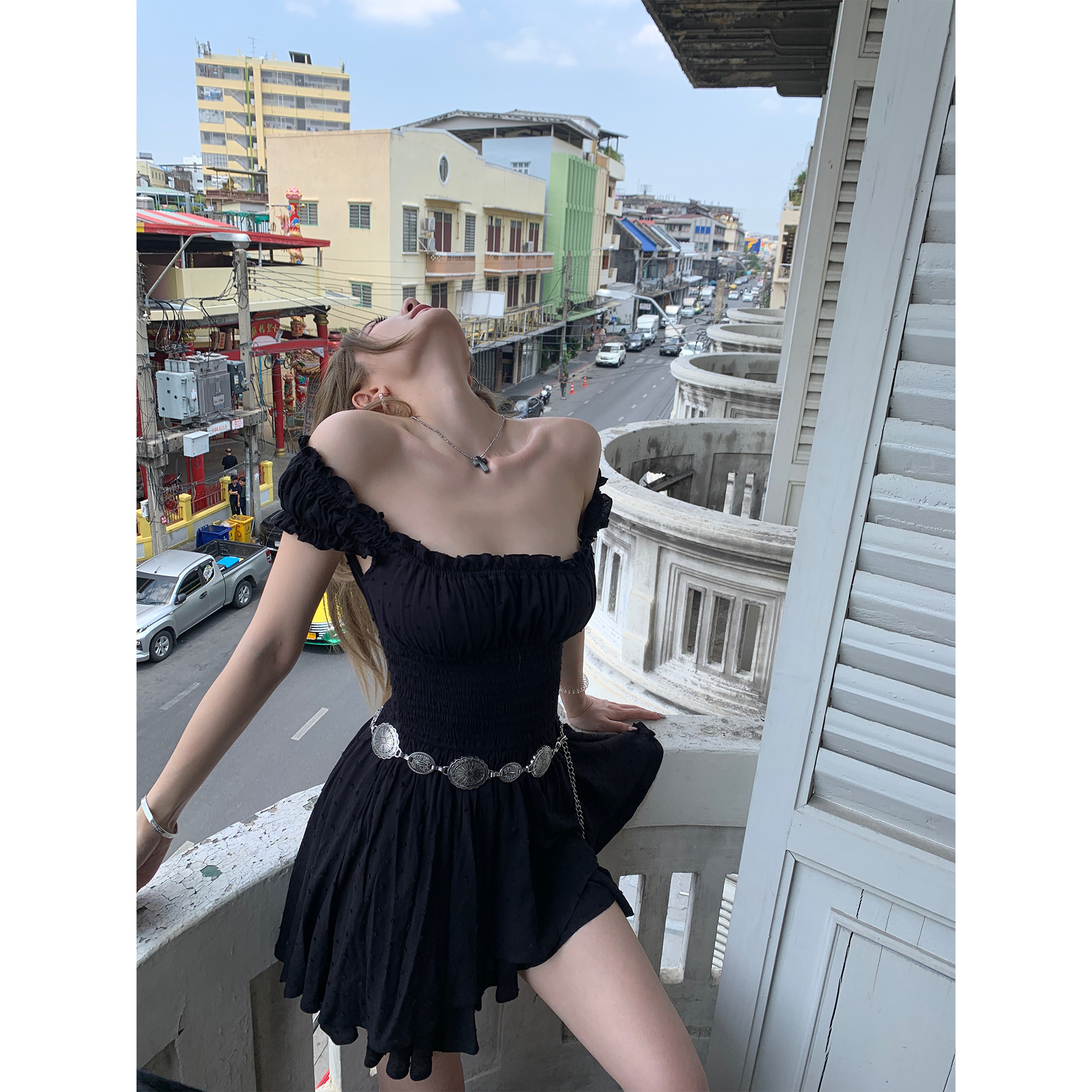 漫天繁星点点 !真丝双绉显瘦黑色连衣裙100桑蚕丝一字领长裙女