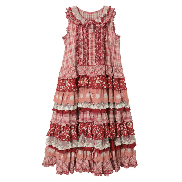 pinkhouse 格纹拼布点点纱玫瑰兔子印花刺绣段段无袖连衣裙