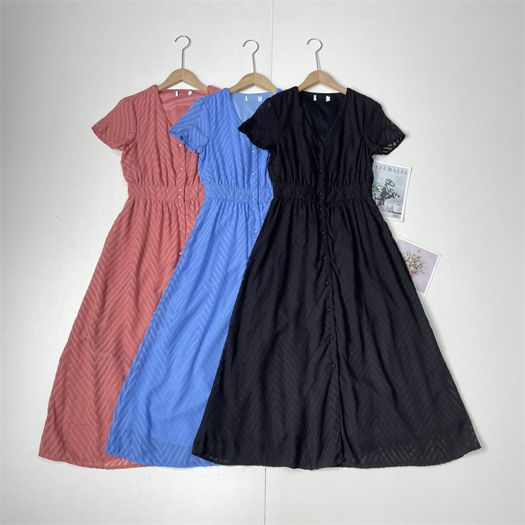 G4提花点点~外单25年夏季女士短袖V领雪纺连衣裙经典显气质三色