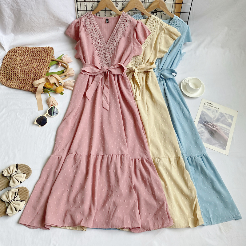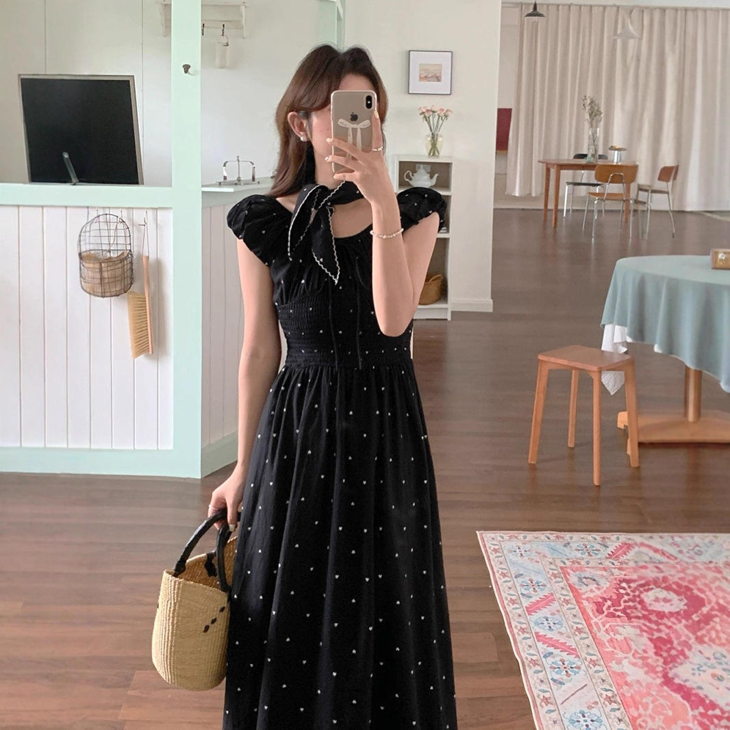 女装夏季十三行韩版法式甜美爱心点点飞飞袖长裙收腰连衣裙配头巾