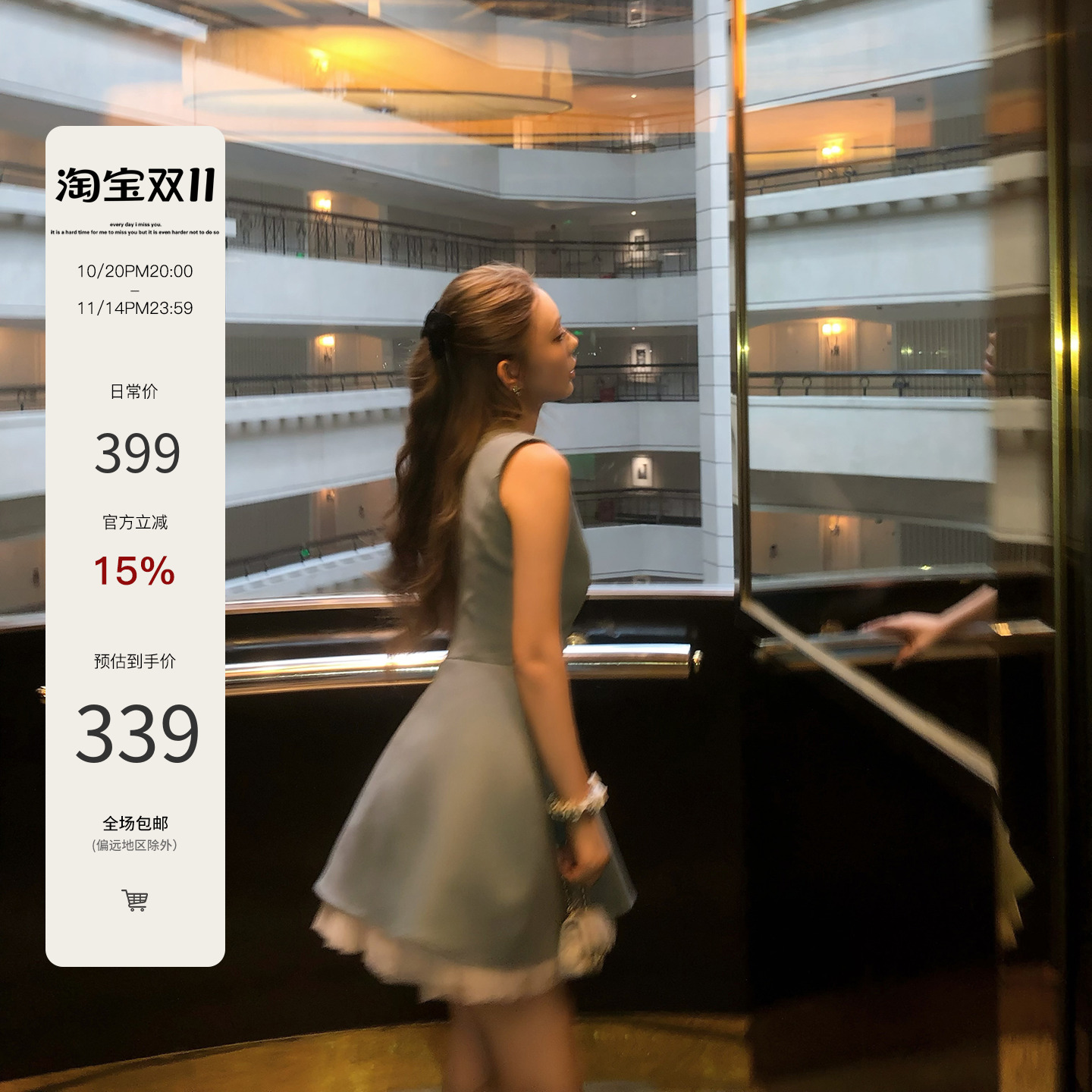 Mas Mash 圆点点小姐 雾霾蓝无袖蓬蓬公主连衣裙女高级感气质短裙