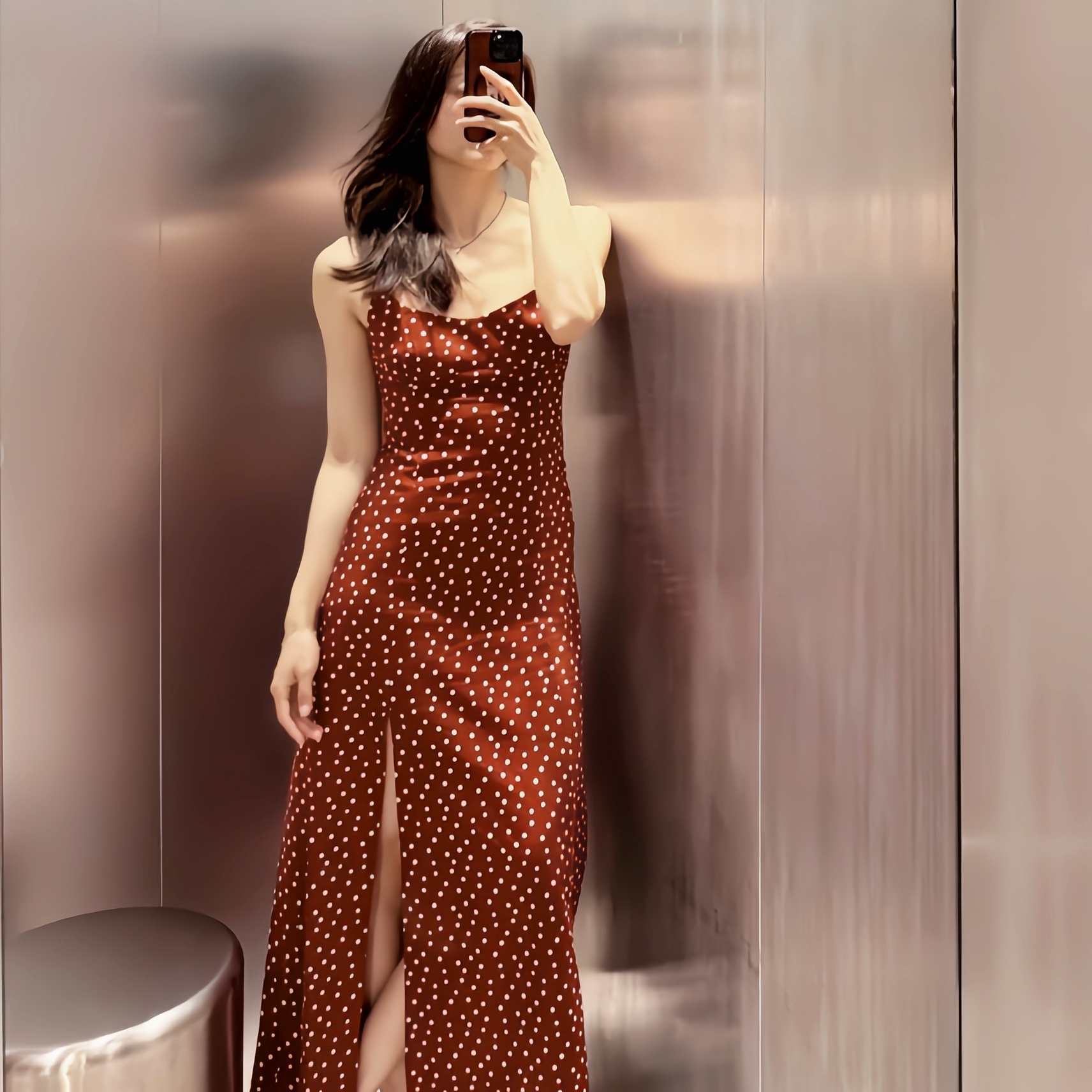 2025女装夏款 绝美酒红波点印花开叉吊带连衣裙女 3049676 960