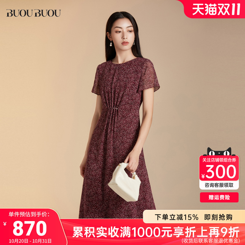 【关注领券】Buou Buou法式浪漫点点印花珍珠扣连衣裙女BJ2G136
