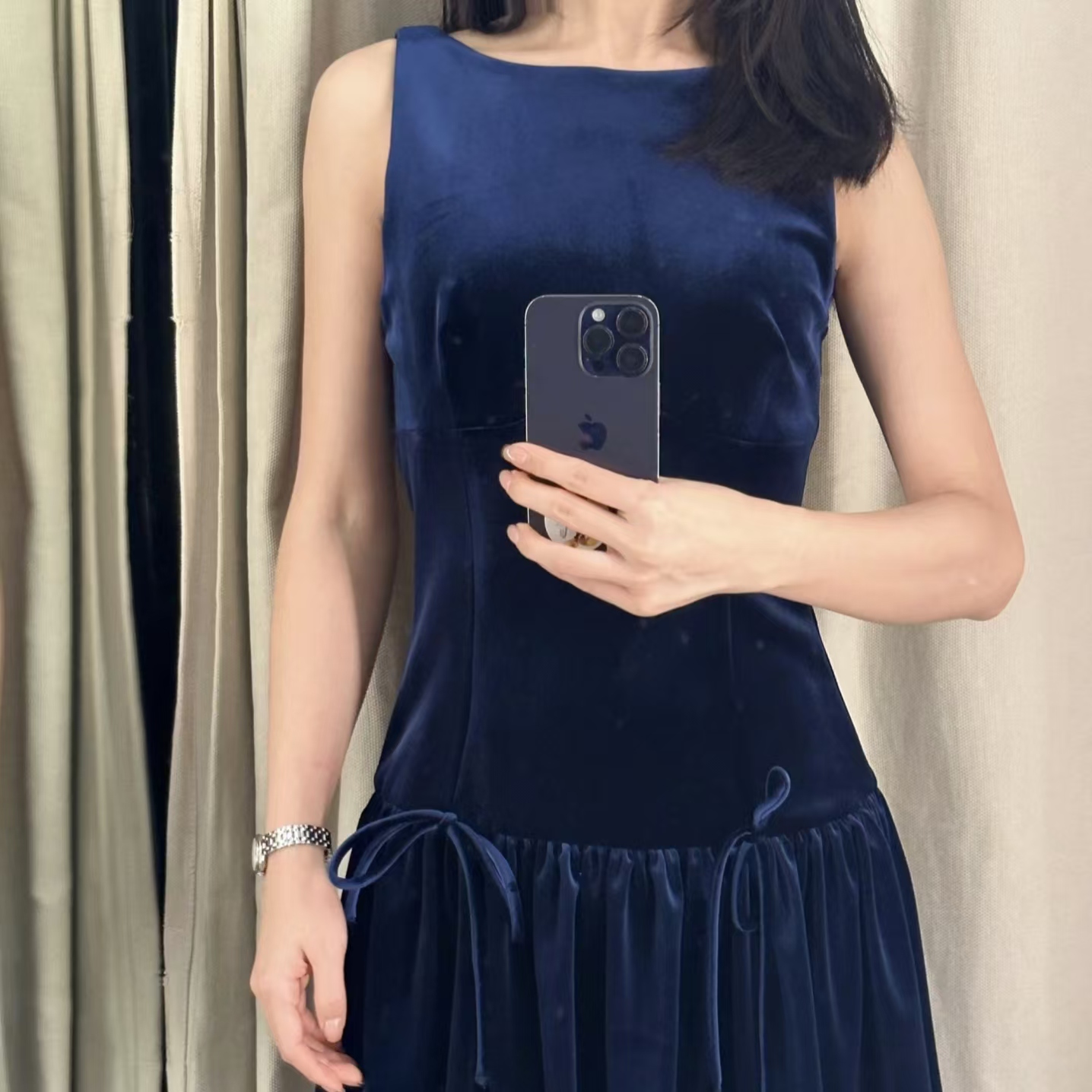 2025年女装深蓝色质感丝绒法式蝴蝶结百褶无袖背心连衣裙 9388072