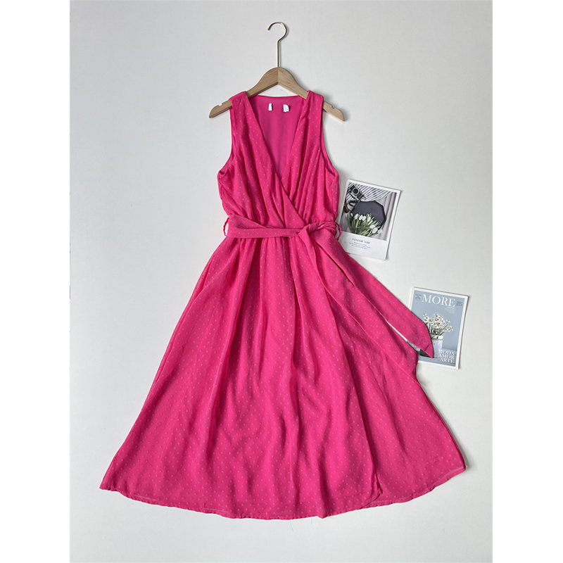 E4提花点点~外单25年夏季女士背心裙V领雪纺A字连衣裙玫红色好款