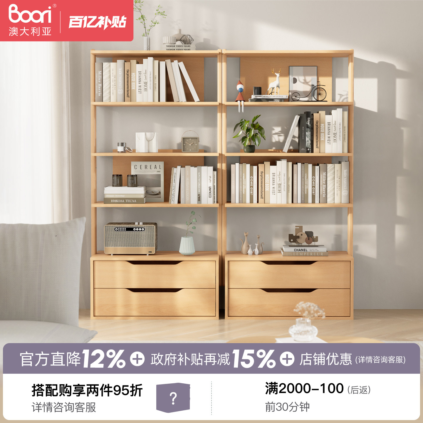 Boori实木落地书架一体靠墙客厅收纳架家用现代简约书房置物柜