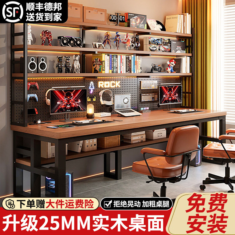 实木洞洞板电脑桌双人写字台现代简约台式家用书桌书架一体电脑桌