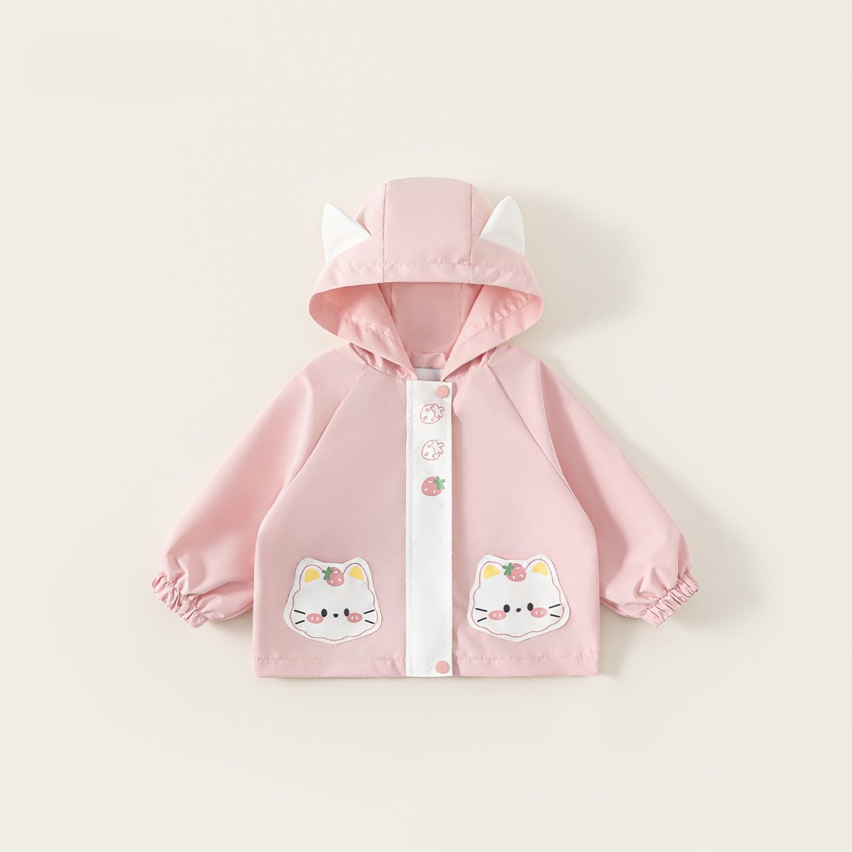女童春款外套新款儿童女宝宝上衣粉色猫咪印花拉链开衫连帽冲锋衣